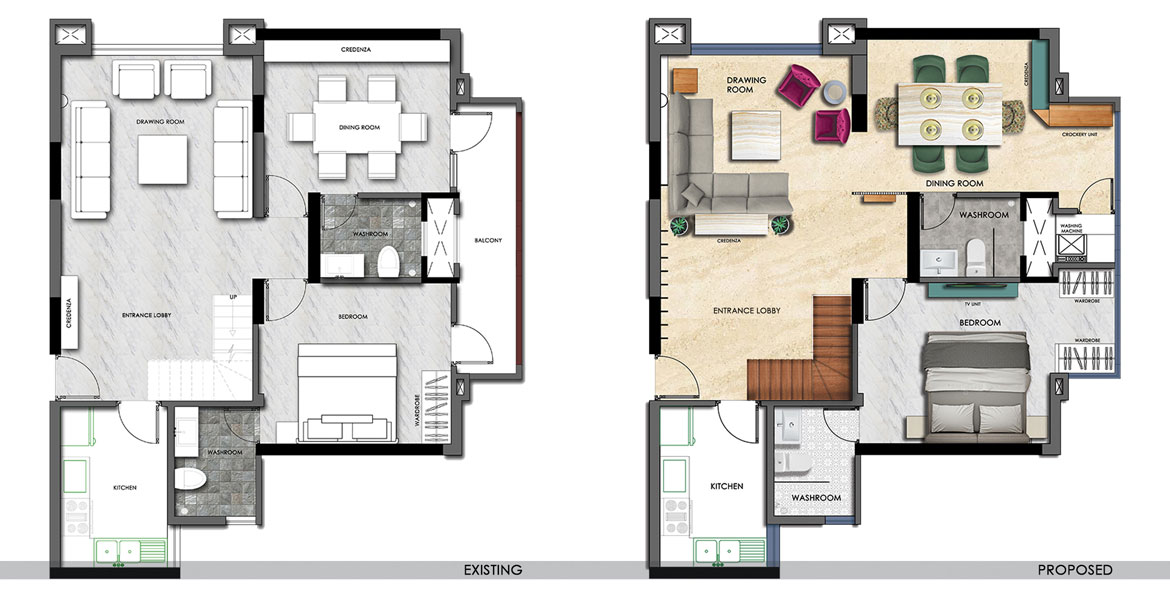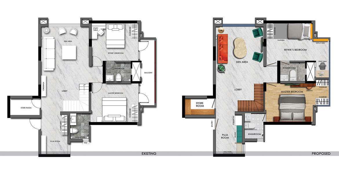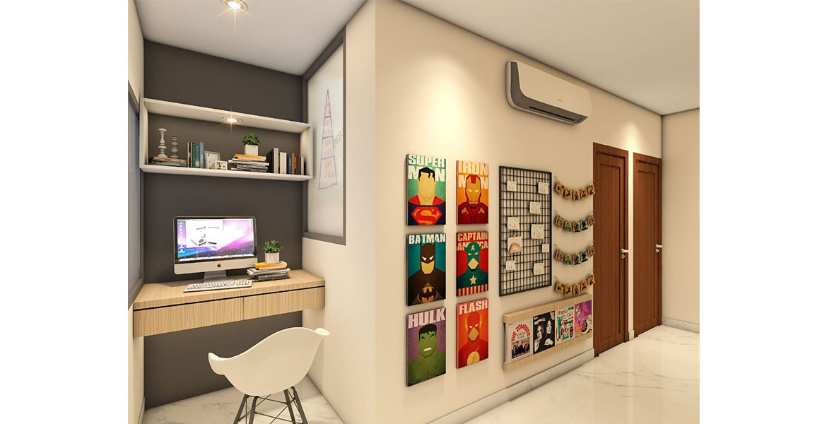 We started the transformation by creatively expanding the liveable space and then moved on to eliminating age-old barriers between the dining and the drawing. The master bedroom required more wardrobe space for which we aesthetically re-crafted the space. With a young artist in the house, his room also mandated an uncluttered commodious environment to inspire creativity. Addition of a sliding bed to accommodate for those impromptu sleepovers and a dedicated space for both studying and painting, fit his mood and style perfectly.