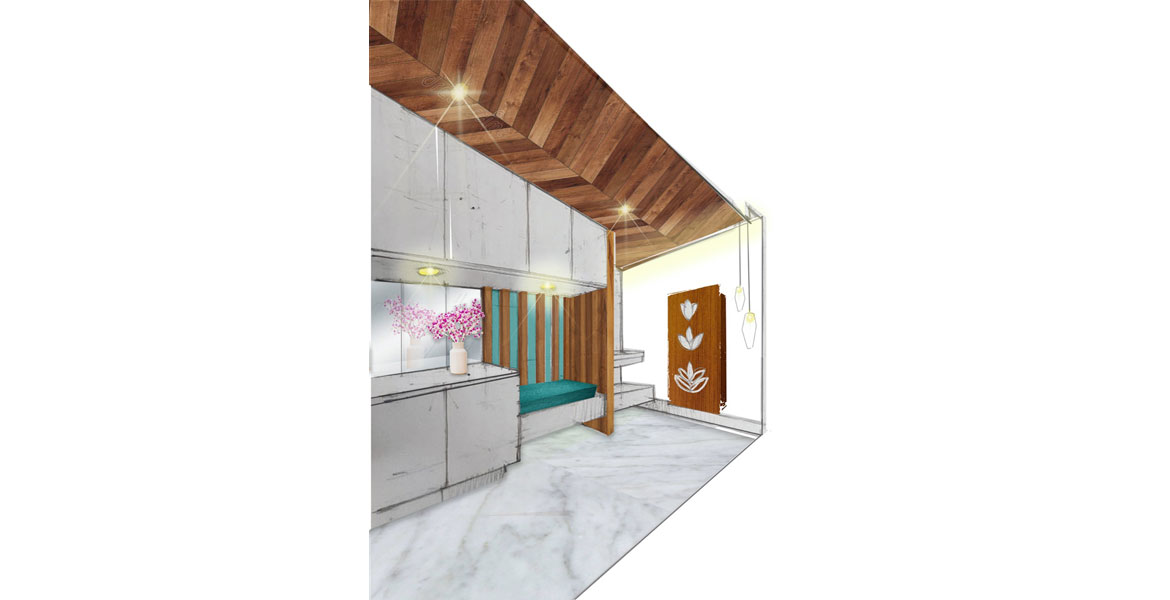 The puja room influenced with a sense of serenity, purity and divinity also had its own eye-catching space utilization. Wall mounted storage units were seamlessly built to accommodate seating with no compromise on aesthetics.