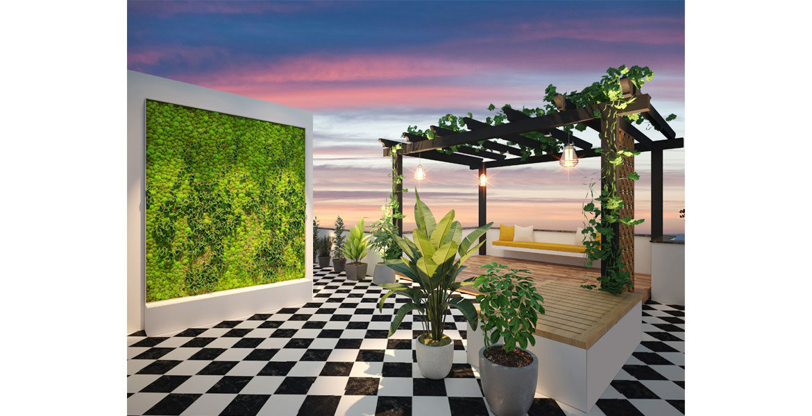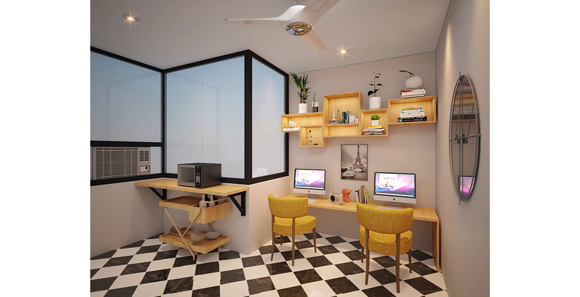 The terrace with its black and white chequered flooring elucidates a classic checkerboard look that compliments the green landscape and wooden pergola. The functional and practical pergola tripled up as a party space, study area and a haven to enjoy the scenic surroundings of the 11th floor. Use of glass partitions further helped strike a balance between enclosure and openness for a quite study area, tucked in a corner with an open terrace on the 12th floor of the high rise.