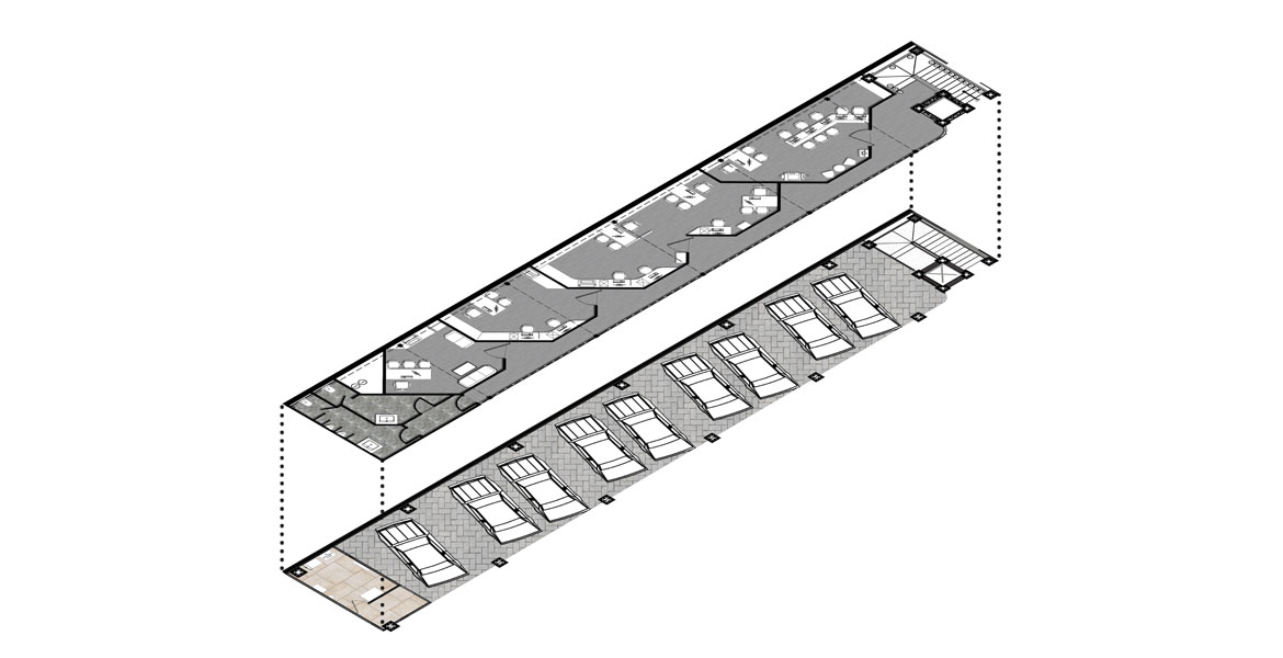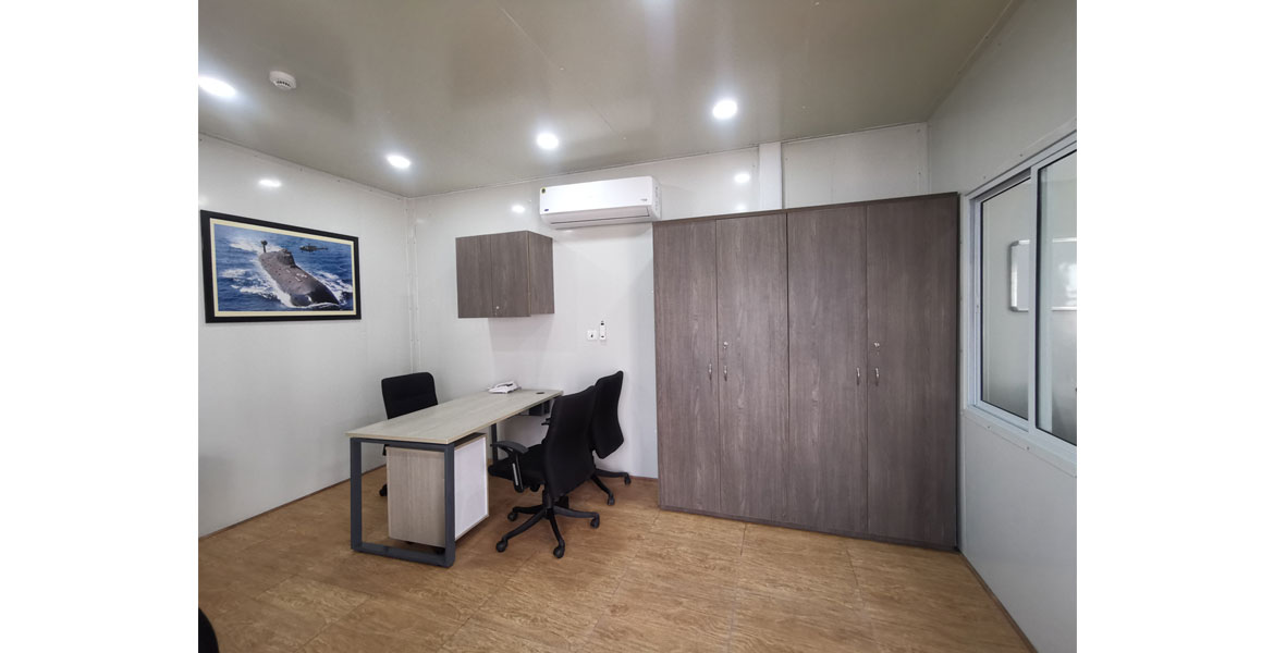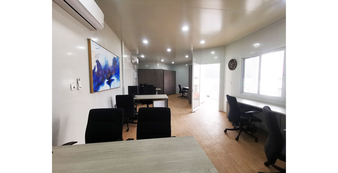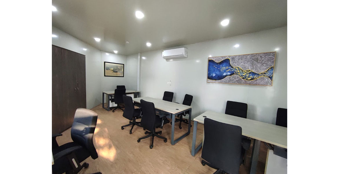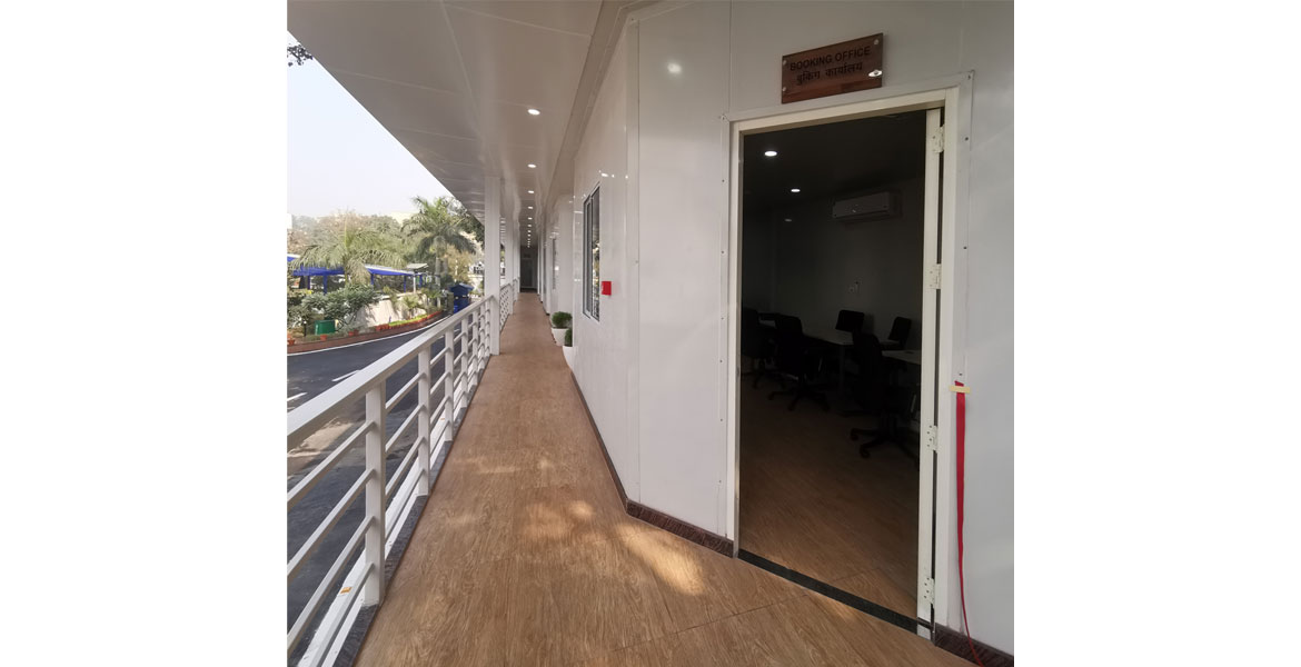 Now, we truly understand that a well-maintained parking lot and being in-sync with the evolving times is a reflection of the entity. Hence, we proposed the concept for stilt parking with a functional space above it. While the stilt parking increased parking space from 8 cars to 13 cars, the space above it was crafted into a lightweight office structure replete with modular fitments and a low maintenance inclined roof. Ergonomic and efficient space utilization in the interiors further enhanced the overall mood and productivity. Refabricated, insulated and inclined walls were also set in motion to conserve energy and to break the monotony of a long corridor.
